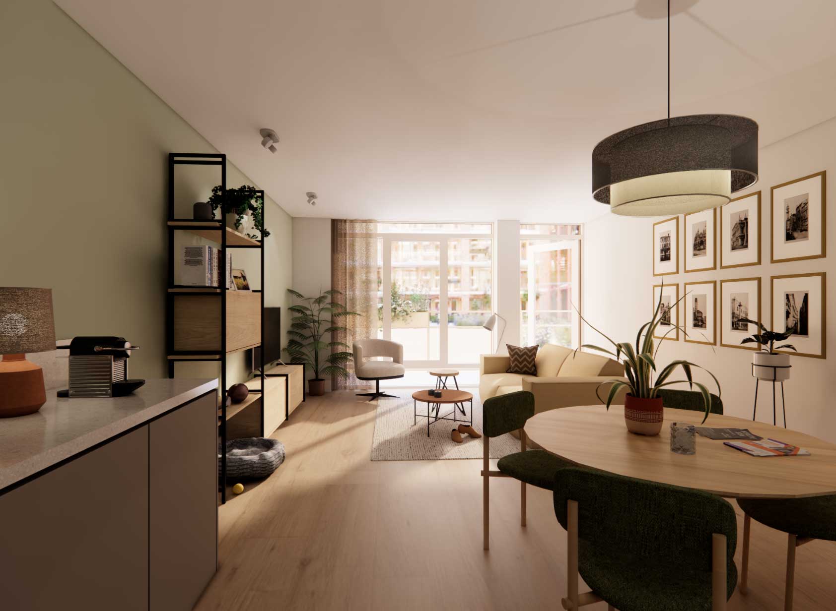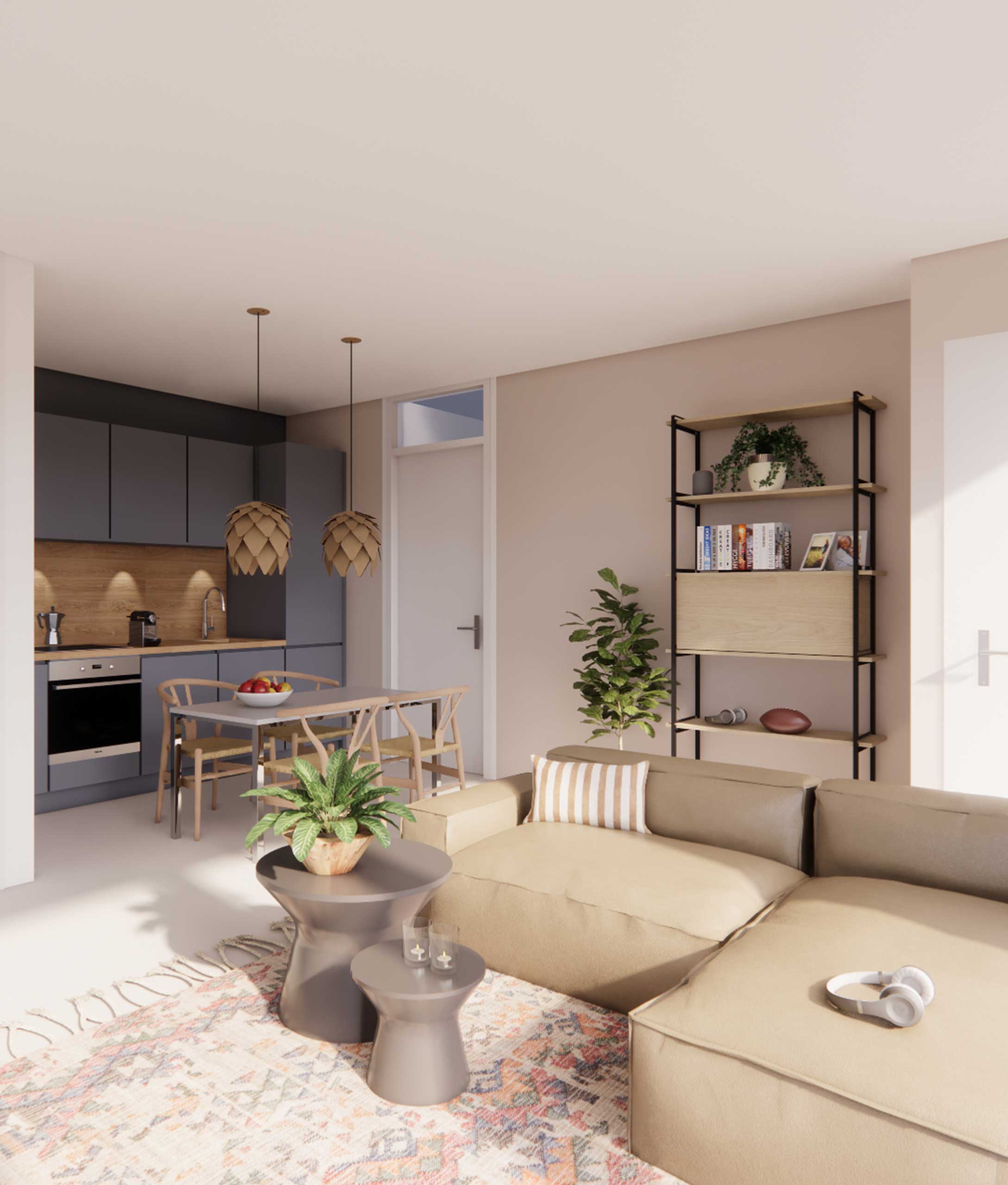 MIX rdam draait om meer dan je eigen woning. In het hart van het project ligt een groene collectieve binnentuin: een plek om te ontspannen, te picknicken of gewoon een praatje te maken. Een extra gedeelde woonkamer met terras vind je daarnaast in MIXTRA. Voor een gezellig etentje met vrienden bijvoorbeeld, een spelletjesavond of een verjaardagsfeest. Bewoners kunnen deze ruimte eenvoudig reserveren via de VvE. Ook aan praktisch gemak is gedacht: drie overdekte fietsenstallingen houden (bak)fietsen droog en veilig. Zo groeit MIX rdam uit tot een community waar ontmoeten, delen en gemak hand in hand gaan.